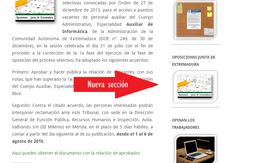 Recordaros que hace unos meses estrenamos nueva sección donde encontraréis información OFICIAL actualizada de todos los procesos selectivos que se están desarrollando, donde iremos destacando en cada uno de los enlaces a las distintas pruebas selectivas las últimas novedades que se vayan produciendo así como los acuerdos y comunicados de los distintos Tribunales.