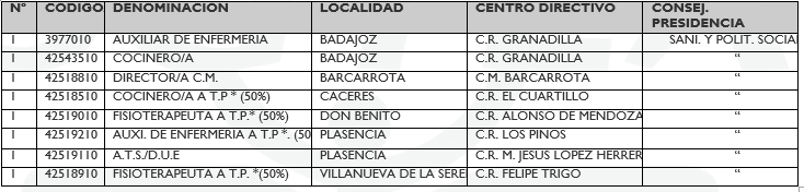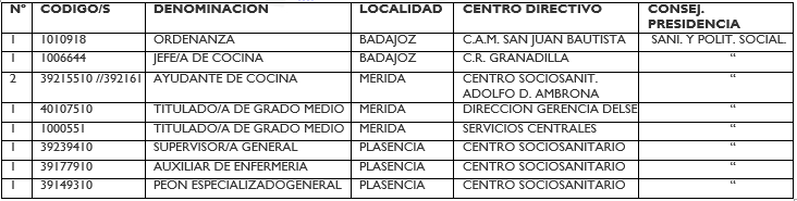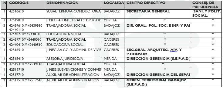 MODIFICACIONES LABORALES: 41627410TERAPEUTA OCUPACIONA pasa de Mérida a Badajoz; 41627010TRABAJADOR/A SOCIAL, pasa de Mérida a Badajoz; 41631210 TRABAJADOR/A SOCIAL, pasa de Zafra a Badajoz; 41621010 TRABAJADOR/A SOCIAL, pasa de Trujillo a Brozas; 41624810 TERAPEUTA OCUPACIONA, pasa de Mérida a Cáceres; 41624610TRABAJADOR/A SOCIAL, pasa de Brozas a Cáceres; 41624110 TRABAJADOR/A SOCIA, pasa de Mérida a Castuera; 41629810TERAPEUTA OCUPACIONAL, pasa de Zafra a Mérida; 41624410 TRABAJADOR/A SOCIAL, pasa de Castuera a Mérida; 41629510 TRABAJADOR/A SOCIAL, pasa de Cáceres a Mérida; 41620310TRABAJADOR/A SOCIAL, pasa de Herrera del Duque a Talarrubias; 41620110 TERAPEUTA OCUPACIONAL, pasa de Talarrubias a Villanueva de la Serena; 41623410TRABAJADOR/A SOCIAL, pasa de Talarrubias a Villanueva de la Serena; 41629410 TRABAJADOR/A SOCIA, pasa de Mérida a Zafra