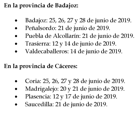 La Dirección General de Función Pública ha publicado una Resolución sobre reducción del horario de los centros o servicios vinculados al ámbito de personal de la administración general de la Junta de Extremadura con motivo de la celebración de festividades tradicionales en el mes de junio de 2019.