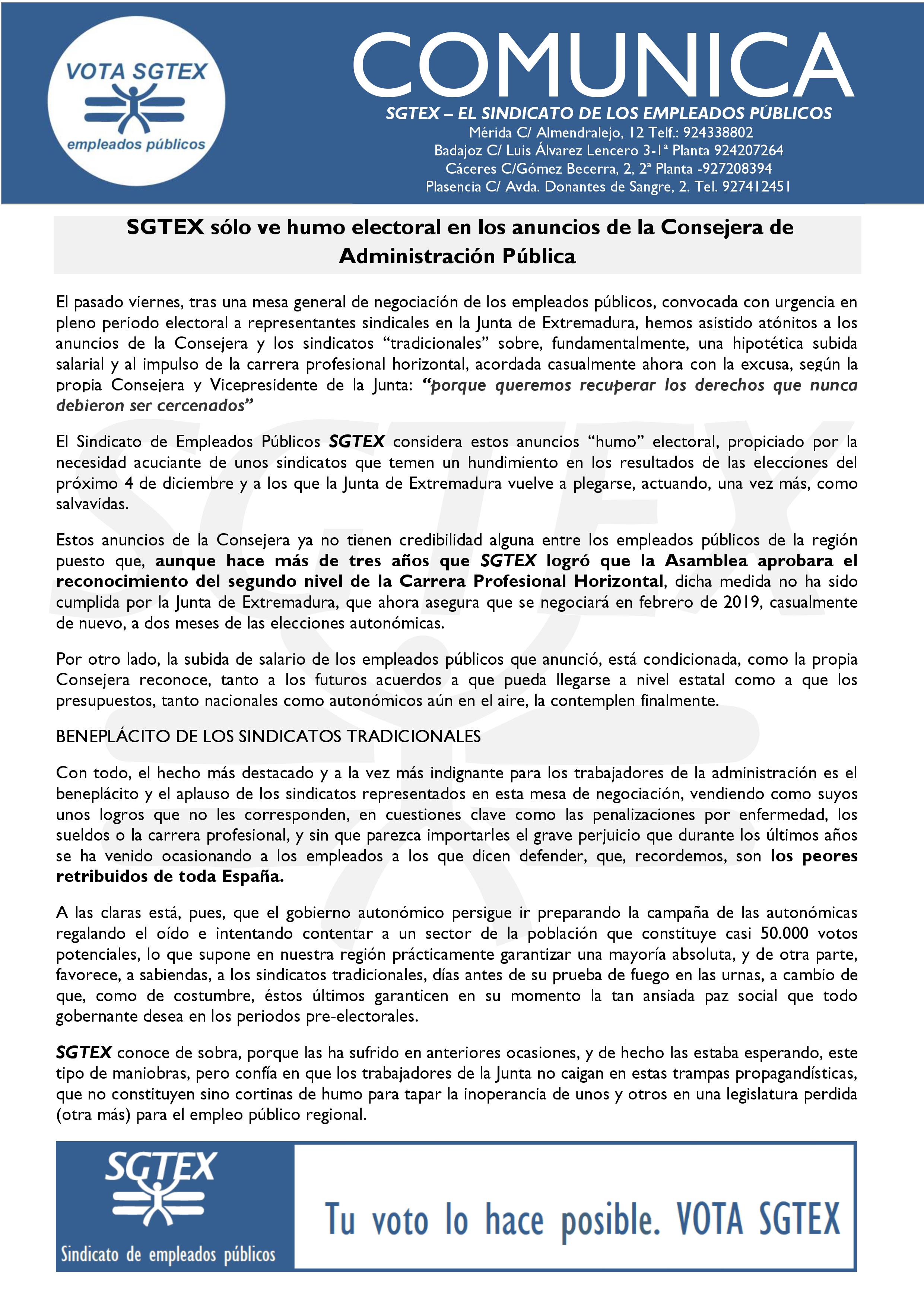 SGTEX, no obstante, agotará todas las instancias judiciales, recurriendo el incumplimiento del acuerdo de carrera profesional y llama a todos los empleados públicos de la administración autonómica a visualizar, en cada centro de trabajo de la Junta de Extremadura, su hartazgo y malestar, saliendo a las calles en una manifestación masiva, a la que convocaremos en próximas fechas.