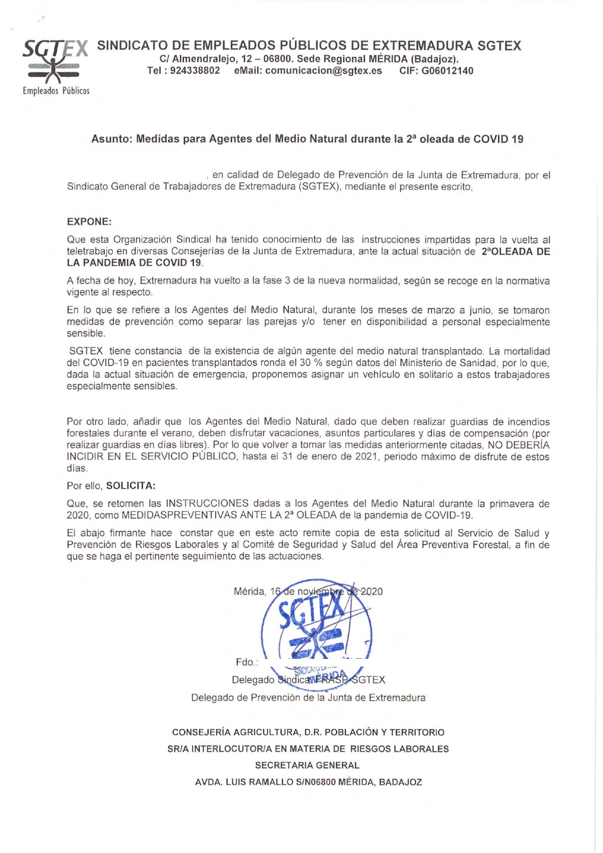 El Sindicato de Empleados Públicos de Extremadura (SGTEX), ha presentado escrito ante la Secretaría General de la Consejería de Agricultura, Desarrollo Rural, Población y Territorio, solicitando que se retomen las INSTRUCCIONES dadas a los Agentes del Medio Natural durante la primavera de 2020, como MEDIDAS PREVENTIVAS ANTE LA SEGUNDA OLEADA de la pandemia de COVID-19.