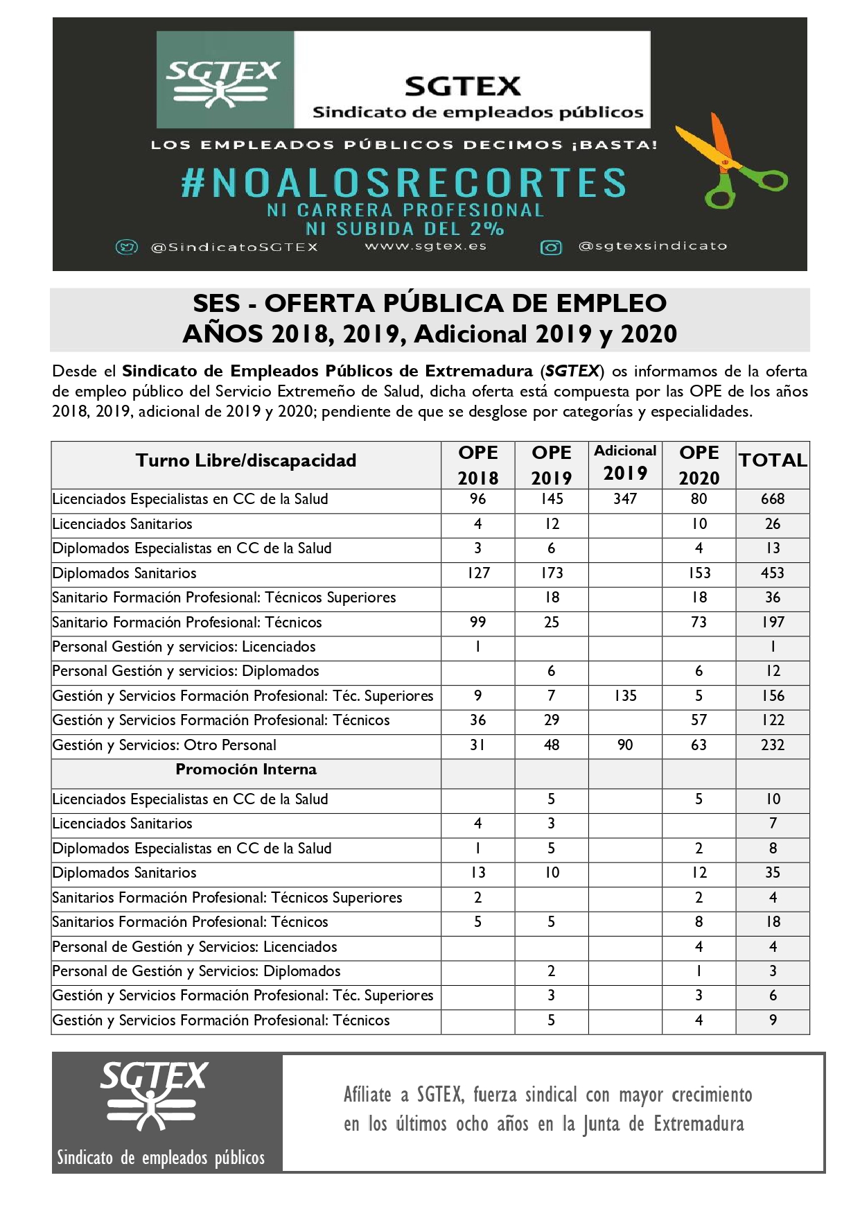 Desde el Sindicato de Empleados Públicos de Extremadura (SGTEX) os informamos de la oferta de empleo público del Servicio Extremeño de Salud, dicha oferta está compuesta por las OPE de los años 2018, 2019, adicional de 2019 y 2020; pendiente de que se desglose por categorías y especialidades.