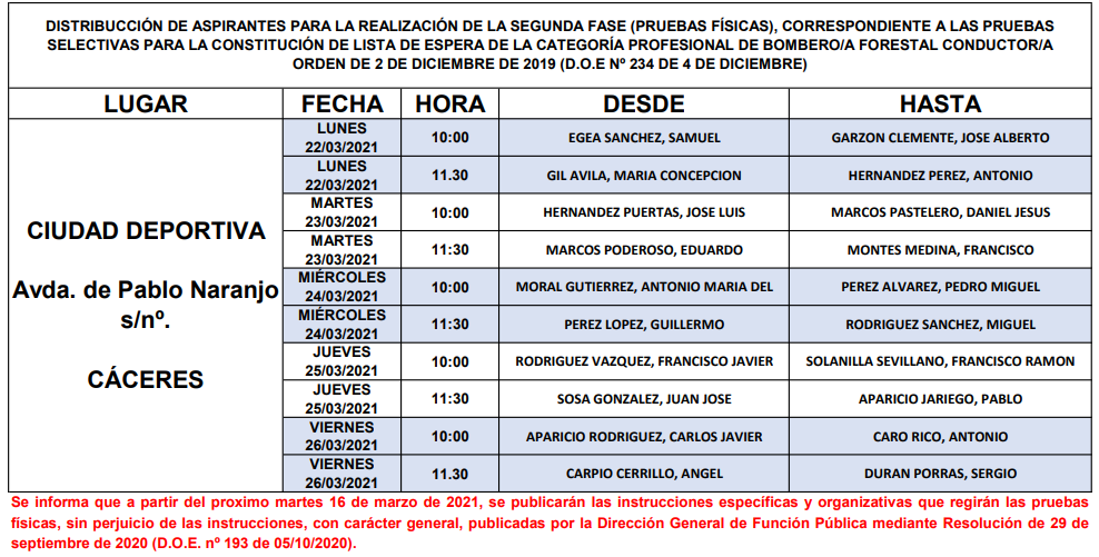 Se connvoca a los aspirantes que han superado el primer ejercicio (cuestionarios), a la realización del segundo ejercicio, consistente en la realización de una prueba física con carácter eliminatorio, recogidas en el Anexo IV de la citada Orden de convocatoria, los días 22, 23, 24, 25 y 26 de marzo de 2021, en la Ciudad Deportiva, Avda. de Pablo Naranjo s/nº. en la localidad de CÁCERES.