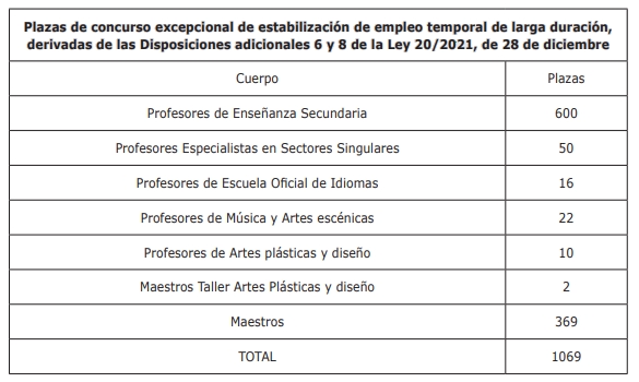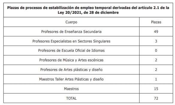 La presente Oferta de Empleo Público incluye, en aplicación de lo previsto en el artículo 2.1 y Disposiciones adicionales 6 y 8 de la Ley 20/2021, de 28 de diciembre, de Medidas urgentes para la reducción de la temporalidad en el empleo público, las plazas de personal docente no universitario que se detallan en Anexo I a este Acuerdo, que puedes obtener al final de este post.