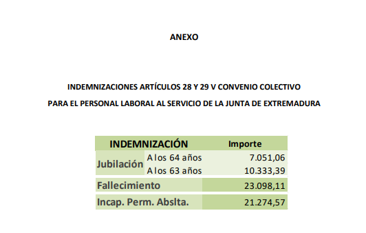 Personal laboral de la Junta de Extremadura. Actualizados los importes de las indemnizaciones por jubilación, fallecimiento o incapacidad permanente absoluta