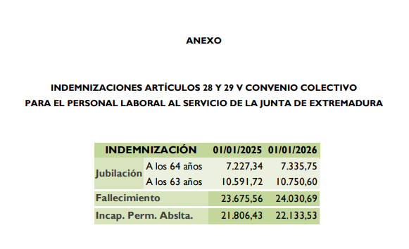En dicha Resolución se acuerda actualizar los importes de las indemnizaciones de los artículos 28 y 29 del V Convenio Colectivo para el personal laboral al servicio de la Junta de Extremadura, con efectos desde el 1 de enero de 2025 y 2026.