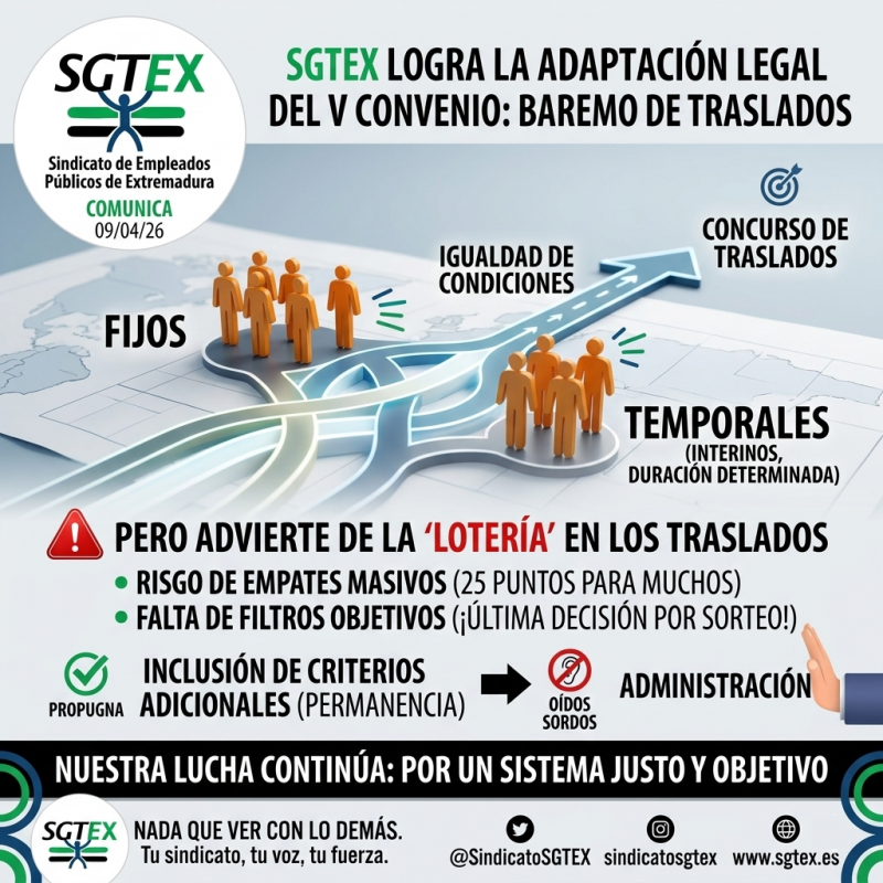 Desde el Sindicato de Empleados Públicos de Extremadura (SGTEX), os informamos que, hoy, 9 de abril de 2026, se ha publicado en el D.O.E. la modificación del Artículo 15.1.5 b) del V Convenio Colectivo, relativa al baremo de méritos en los procedimientos de provisión de puestos (Concurso de Traslados). ¿En